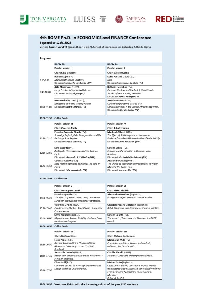 The 4th Rome PhD in Economics and Finance Conference will be hosted by Tor Vergata University of Rome on September 12, 2025. The conference aims to provide a platform for PhD students in Economics and Finance from Luiss, Sapienza University of Rome, Tor Vergata University of Rome, and the Rome Economics Doctorate, to share their ongoing research with other PhD colleagues in Rome.
