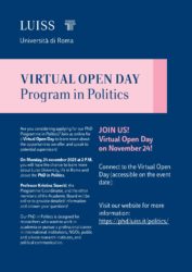 Are you considering applying for our PhD Programme in Politics? Join us online for a Virtual Open Day to learn more about the opportunities we offer and speak to potential supervisors! On Monday, 24 november 2025 at 2 P.M. you will have the chance to learn more about Luiss University, life in Rome and about the PhD in Politics.